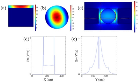 To verify that the designed hybrid waveguide has both stronger field intensity and a stronger mode-limiting capability than the traditional SP waveguide, we simulated both the SP and nanowire waveguide modes and compared them with those of the HPW. As shown in Figure 2a–c, the electric field intensity of the hybrid waveguide is higher than the sum of the SP mode and the nanowire waveguide mode, thus indicating that the HPW structure can achieve strong coupling and that the mode area is limited to within a smaller range. Figure 2d,e shows the curves of the normalized electric field intensities of the horizontal transverse and longitudinal transverse modes in Figure 2c versus the changes in the transverse coordinates. The electric field energy is mainly concentrated at the junction between the dielectric layer and the nanowires and at the air gap.