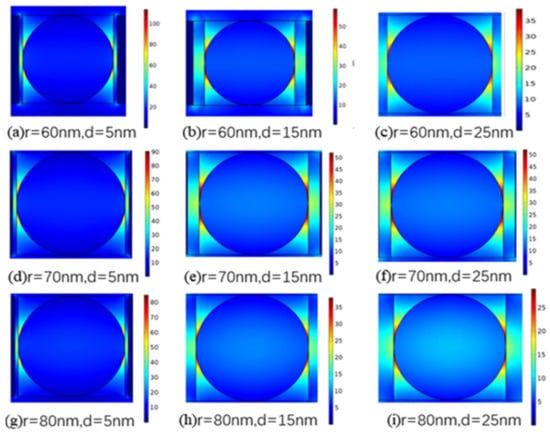Electric field distributions for different values of nanowire radius r and dielectric layer thickness d. (a) r = 60 nm, d = 5 nm; (b) r = 60 nm, d = 15 nm; (c) r = 60 nm, d = 25 nm; (d) r = 70 nm, d = 5 nm; (e) r = 70 nm, d = 15 nm; (f) r = 70 nm, d = 25 nm; (g) r = 80 nm, d = 5 nm; (h) r = 80 nm, d = 15 nm; (i) r = 80 nm, d = 25 nm. When r is 60 nm and d is 5 nm, the electric field intensity has its highest value. When d and r increase, the electric field intensity decreases gradually. An increase in r causes the energy to converge gradually toward the nanowires.