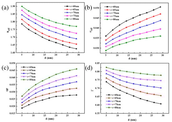 The mode properties change with the nanowire radius r and dielectric layer thickness d. (a) The effective index , (b) the effective propagation loss , (c) the normalized model area SF and (d) the confinement factor Γ.