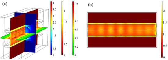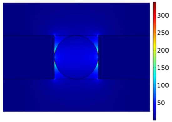 In this section, we apply graphene, a relatively new material with excellent photoelectric properties, to the dielectric layer of the HPW, analyze the electric field distribution and mode characteristics of the structure, and compare it with the corresponding waveguide based on the MgF2 material layer. Since it is difficult to fabricate and simulate single-layer graphene in experiments and simulations, respectively, multilayer graphene is selected in this paper. To ensure that the optical properties of graphene are not reduced, the number of layers should not be too high. Therefore, we selected 5-nm-thick multilayer graphene as the dielectric material. As shown in Figure 5, when r is 80 nm, the electric field intensity of the waveguide mode is much higher than the corresponding maximum value for the device with the MgF2 dielectric layer shown in Figure 2.