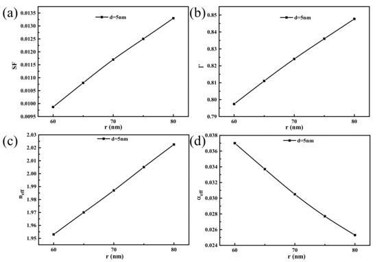 When dielectric layer thickness d = 5 nm, the mode properties change with the nanowire radius r. (a) The normalized model area SF, (b) the confinement factor Γ, (c) the effective index and (d) the effective propagation loss .