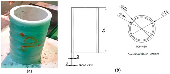 GFRP was used to reinforce PVC tubes at four different fibre orienta-tions, 45°, 55°, 65° and 90°, where the reference axis 0° corresponds to the longitudinal ax-is of the tubes. The selection of the fibre orientation is random. The fabricated composite tubes were subjected to quasi-static axial compression tests to determine the effect of GFRP reinforcement and fibre orientation on their crashworthiness properties. The specimens prepared for compressive testing had a length of 94 mm. The PVC inner tube had an outer diameter of 50 mm and a thickness of 2 mm. The weight of the PVC inner tube on its own was about 0.038 kg. The thickness of the added glass fibre/epoxy reinforcement was an average of approximately 3 mm. Figure 1a,b show the GFRP/PVC sample being faced using a turning machine and the Schematic diagram of top and side views, respectively.