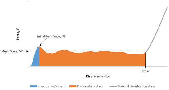 The mean crushing force (MCF) is the average force that a composite structure experiences under compression. This quantity is calculated while excluding forces experienced in the densification stage Equation (3) [29]: