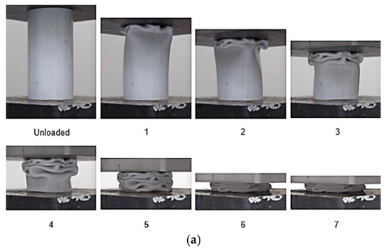 Here, F (N) is the compressive load. The specific energy absorption (SEA) gives a measure of the absorbed energy about the mass of the structure, Equation (2):