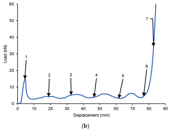 To determine the effect of using GFRP to reinforce the PVC tubes used as the frame for the composite tubes, it was necessary to first observe the load behaviour of a PVC tube on its own, with the PVC tube having dimensions identical to those used in the composite tubes for the crushing tests. Figure 4 shows the load–displacement curve for the PVC tube and the corresponding images. Figure 4 shows that, initially, the graph has a straight-line region, where load increases in direct proportion to the displacement of the composite tube. The load eventually reaches a local maximum, the initial peak load, after which the load drops noticeably. For the PVC tube, the initial peak force had a value of approximately 15.14 kN and occurred at a displacement of about 4.599 mm. The images in Figure 4 show that the failure mechanism for the PVC tube was progressive folding. The progressive failure was expected as plastic tubes typically undergo progressive folding under compression, as is characteristic of Mode III failure. The compressive stress exerted on the PVC tube increased until it was large enough that it caused the tube wall to buckle locally and form a hinge. It was observed that the formation of the first hinge in the PVC tube happened simultaneously as the initial peak force was reached. After this, as the first fold formed, quite a considerable drop in load-bearing capability occurred as it dropped from 15.14 kN down to about 2.732 kN. Following this, folds continued to form, and, for each fold, stresses built up in the tube wall, forming a hinge, followed by a subsequent drop in the load-bearing capacity as folding occurred. However, for the second fold onwards, the load’s rise and fall were not as high, and the failure was more stable as a result. The region starting from the displacement where the initial peak force occurred, 4.599 mm, up to the displacement at which densification began for the PVC tube, 77.56 mm, is the post-crush stage for the specimen. For the post-crush stage of the PVC tube, the average load was approximately 4.397 kN. After the displacement value of 77.56 mm, the load value increased drastically.