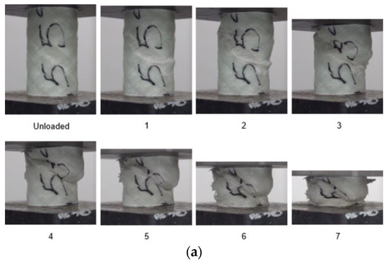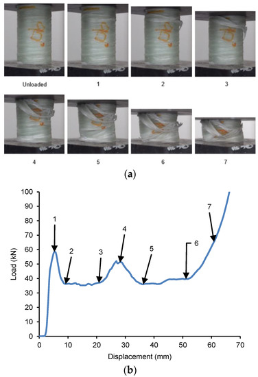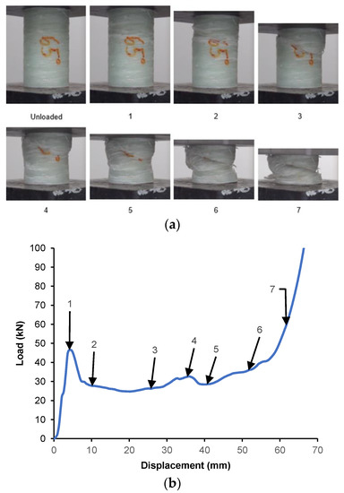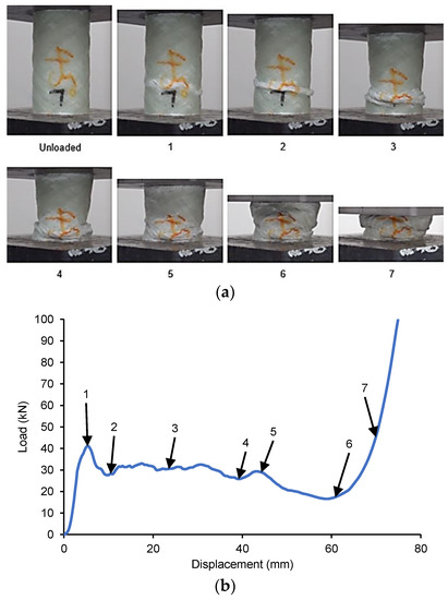 Figure 7 shows the load–displacement graph for the GFRP/PVC 55° composite tube when subjected to quasi-static axial crushing and the images corresponding to the points labelled in the graph. During the pre-crush stage, the top section of the tube first shifted noticeably towards one side due to transverse shear failure. During this transverse shear failure, longitudinal cracking was almost negligible, and the cracks formed were predominantly along the angle of fibre orientation.