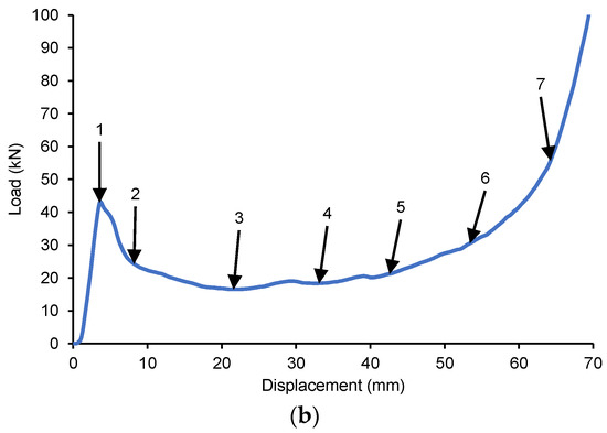 Figure 8 shows the load–displacement graph for the GFRP/PVC 65° composite tube when subjected to quasi-static axial compression and the images corresponding to the points labelled in the graph. At first, due to the build-up of transverse shear stress, the top third of the composite tube specimen shifted slightly to the side, and a fracture plane was formed due to circumferential cracking. The fracture plane fully formed at the initial peak load of 46.62 kN, which occurs at a displacement of about 4.245 mm. The two sections of the tube then continued to interpenetrate through one another, while the matrix cracks caused by the split also lengthened, resulting in the tube’s load-bearing capacity decreasing. Initially, the load dropped quite steeply until it reached a value of about 29.90 kN at a displacement of 7.625 mm. This type of catastrophic drop in load-bearing capacity is characteristic of Mode II failure.