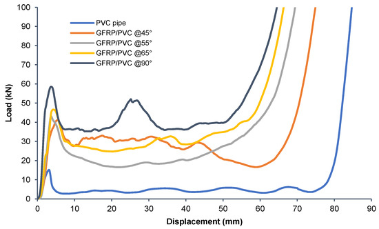 Load–displacement curves for axial compression tests of all GFRP samples vs. PVC tube.