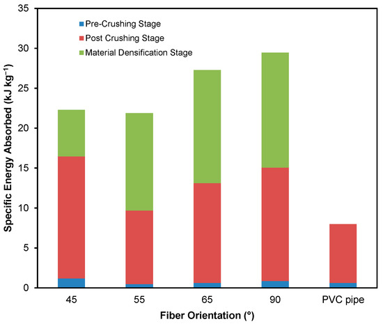 Figure 11 shows the specific energy absorbed by the GFRP PVC tubes and the PVC tube on its own. The worst-performing GFRP PVC tube (i.e., GFRP/PVC 55°) had a higher value than that of the PVC tube on its own. The GFRP/PVC 55° specimen had a good specific energy absorption of 9.69 kJ kg−1, which was approximately 21.49% higher than the 7.98 kJ kg−1 value for the PVC tube on its own. For the total useful specific energy absorbed by the tested GFRP tubes, the GFRP/PVC 45° composite tube performed the best, with pre-crush and post-crush specific energy absorbed, adding up to approximately 16.47 kJ kg−1. Although the GFRP/PVC 45° specimen’s load-bearing capability did not stand out, due to its comparatively lower mass and delayed densification, it could perform well in energy absorption capability. The GFRP/PVC 90° specimen exhibited the next best performance with a total useful specific energy absorbed 15.05 kJ kg−1. Finally, the GFRP/PVC 65° specimen had a good specific energy absorption of about 13.12 kJ kg−1.