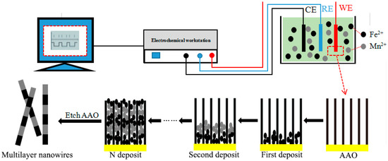 For the electrochemical deposition of Fe/Mn multilayer NWs, the composition of the electrolyte used was 1.5 g/L FeSO4·7H2O, 215 g/L MnSO4, 130 g/L (NH4)2SO4, 1 g/L SnO2, and 25 g/L H3BO3. The solution pH was adjusted to 6.0–7.5 by adding a little H2SO4 and NH3 solution. The deposition voltage, deposition time, and cyclic deposition times of Fe and Mn layers are shown in Table 1. The template was washed with deionized water and dried after deposition. The deposition process is shown in Figure 1.