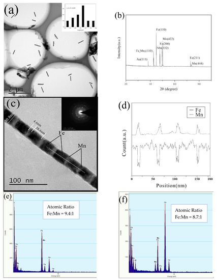 Characterization of multilayer 4# Fe/Mn NWs: (a) TEM image of a large number of NWs; the inset shows the length distribution of NWs; (b) XRD of NWs; (c) TEM image of a single NW; (d) EDX linear scan of a single NW; (e) EDS analysis of a single NW; (f) EDS spectra of a large number of NWs.