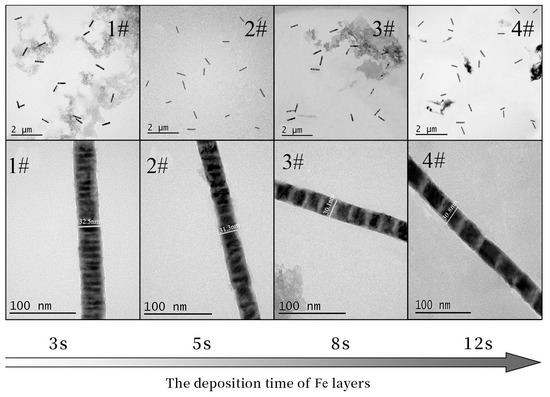 Figure 4 is the TEM diagram of 1#~4# Fe/Mn multilayer NWs prepared using different Fe deposition times. We can see that the four NWs are of uniform thickness and have a smooth surface, and the interface between the Mn layer and the Fe layer is clearly visible; the length of each layer is uniform. The length and diameter of the four NWs are listed in Table 3. It can be seen that the diameter (about 30 nm) and the length (about 0.5 μm) of the four NWs are relatively similar. With the increase in Fe deposition time, the length of the Fe layer increases correspondingly. The length of the Mn layer in the 1#~4# Fe/Mn multilayer NWs is about 5 nm, while the length of the Fe layer is approximately 5, 10, 20, and 40 nm, respectively. The growth rate of the Fe layer increases gradually from 2 to 3.3 nm/s, and the growth rate of the Mn layer is about 5 nm. The results show that the length of each layer can be adjusted by controlling the deposition time of each layer of the Fe/Mn multilayer NWs. Therefore, we can obtain multilayer NWs with different diameters and sublayer lengths using electrodeposition.