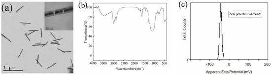 (a) TEM image of 4# Fe/Mn@SiO2 NWs; the inset shows an individual NW enlarged; (b) FT-IR spectra; (c) zeta potential.