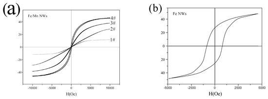 The magnetic properties of 1#~4# Fe/Mn@SiO2 multilayer NWs and Fe NWs were measured by VSM. The results are shown in Figure 6. The magnetic properties calculated from the hysteresis loop are listed in Table 4.
