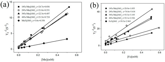 Figure 7a,b show T1 and T2 relaxation properties of Fe/Mn@SiO2 multilayer NWs measured respectively, and the relevant data are listed in Table 5.