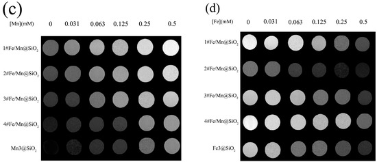 Figure 7c,d show the T1- and T2-weighted MRI images of Fe/Mn@SiO2 multilayer NWs under different Mn concentration gradients and different Fe concentration gradients, respectively. As can be seen from Figure 7c, with an increase in Mn concentration, the T1-weighted MRI images of Fe/Mn@SiO2 multilayer NWs become brighter and brighter. Moreover, under the same Mn concentration, Fe/Mn@SiO2 multilayer NWs have a stronger contrast than Mn@SiO2 NWs. The contrast ratio of 1# Fe/Mn@SiO2 multilayer NWs is the highest, while that of 4# Fe/Mn@SiO2 multilayer NWs is the weakest. As can be seen from Figure 7d, with an increase in Fe concentration, the T2-weighted MRI image of Fe/Mn@SiO2 multilayer NWs becomes darker and darker. Moreover, at the same Fe concentration, the contrast ratio of 2# Fe/Mn@SiO2 multilayer NWs is stronger than that of Fe@SiO2 NWs, while the contrast ratio of 1# Fe/Mn@SiO2 multilayer NWs is the weakest. The above results are consistent with the relaxation data, indicating that the 2# Fe/Mn@SiO2 multilayer NWs have the potential to become a T1-T2 dual-mode contrast agent.