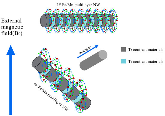 When the length of the Fe layer is different, Fe/Mn@SiO2 multilayer NWs show different relaxation. With the decrease in the length of the Fe layer (40 nm~5 nm), the T2 relaxation of Fe/Mn@SiO2 multilayer NWs first increases gradually (32.1 mM−1s−1~74.8 mM−1s−1) and then decreases rapidly (28.9 mM−1s−1), which may be caused by the differences in the magnetization direction of Fe/Mn@SiO2 multilayer NWs with different lengths of the Fe layer. In general, T2 relaxation is closely related to such factors as the saturation magnetization of the sample and the number of water molecules covered by a nonuniform magnetic field. The stronger the saturation magnetization provided by the multilayer NWs, or the greater the number of water molecules covered by the magnetic field, the faster the hydrogen protons in the water molecules lose phase, thus accelerating and shortening the T2 relaxation process. In the Fe/Mn@SiO2 multilayer NWs 1~4# samples prepared by us, the smaller the length–diameter ratio of the Fe layer, the more the easy magnetization direction of the Fe layer tends to be perpendicular to the long axis direction of the NW; on the contrary, the larger the length–diameter ratio is, the easier the magnetization direction tends to be parallel to the NW direction, as shown in Figure 8. When the direction of easy magnetization is perpendicular to the long axis of NWs, the effective area covered by the magnetic field of Fe/Mn@SiO2 multilayer NWs is the largest. Therefore, the smaller the aspect ratio of the Fe layer is, the more water molecules are covered by the magnetic field generated by Fe/Mn@SiO2 multilayer NWs and the greater the T2 relaxation degree of Fe/Mn@SiO2 multilayer NWs. Although the shorter the Fe layer is the lower the saturation magnetization of the Fe/Mn@SiO2 multilayer NWs is as well, the effective area covered by the magnetic field of the Fe/Mn multilayer NWs plays a leading role in the contribution of T2 relaxation. Therefore, the shorter the Fe layer is, the greater the T2 relaxation of the Fe/multilayer NWs is.