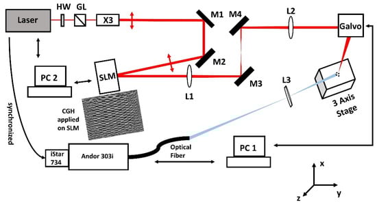 Experiments were carried out with two separate laser and optical systems based at the Universities of Liverpool and Mittweida where the temporal pulse lengths available were 10 ps and 600 fs, respectively. Figure 1 shows a schematic of the optical system in Liverpool. The output from a Nd:VAN seeded Regenerative amplifier (High-Q IC-355-800 ps, 10 ps/1064 nm Photonic Solutions Ltd., Edinburgh, UK) was attenuated, expanded (×3), then directed at low AOI to a phase-only Spatial Light Modulator (SLM, Hamamatsu-10468-03, Hamamatsu Photonics, Hamamatsu, Japan) for generating multi-spot patterns and focussed to a sample mounted on a three-axis stage able to bring the substrate surface to the focal plane. Computer Generated Holograms (CGHs) controlling spot numbers and separation on the substrate were generated using Inverse Fourier Transforms in the Hamamatsu software, while a pick-off optic (not shown) could direct spot patterns to a CCD camera prior to multi-spot ablation. This allows precise electronic control of spot separation with no mechanical movements. A 4f optical system (f1 = f2 = 400 mm) relayed the modulated beam from the SLM (addressed with CGHs) to the input aperture of a galvo system which directed the beams to the target surface, focussed by an f-theta lens (f = 100 mm). A fast-mechanical shutter (Thorlabs SH05, Thorlabs Ltd., Ely, UK) allowed the pulse number on target to be varied, synchronised to the scanning software (SCAPS GmbH). The expanding plumes were imaged to a time-resolved spectrometer (Andor Shamrock, model SR303i with intensified CCD, iStar 734, 2 ns gate width, Andor Technology Ltd., Belfast, UK) and synchronised from the 5 kHz Regenerative amplifier.
