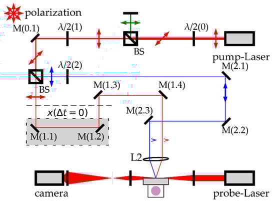 Figure 2 shows a schematic of the optical system for 600 fs/5 kHz double spot ablation (Mittweida). The pump laser (FX-Series, edgewave GmbH, 1030 nm/600 fs, Würselen, Germany) output was attenuated by HWP/polarising beam splitter BS. Afterwards, a second HWP/PBS combination produce two optical lines (1,2) with adjustable power distribution. Line 1 path length was altered by translating mirrors M (1.1) and M (1.2) to synchronise the ablation spots temporally. This synchronisation is proven by the ablation interference patterns with Line 2 at the sample surface. The ablation spot separation was adjusted by slightly tilting mirror M (1.4). Both lines were focussed onto the sample surface by an f = 100 mm optic L2. At the focal plane, the laser spot radii are w86 = 15 µm. A spot monitor (CCD) on the level of the material surface to enable a precise temporal and geometrical adjustment. A probe laser (Cavilux, Fa. Cavitar Ltd., 688 nm/13 ns, Tampere, Finland) electronically synchronised to the pump laser allowed pump-probe shadowgraphy of expanding plasma plumes. The shadowgraphs were recorded with a 14-bit cooled CCD camera (pco.1600, PCO AG, Kelheim, Germany).