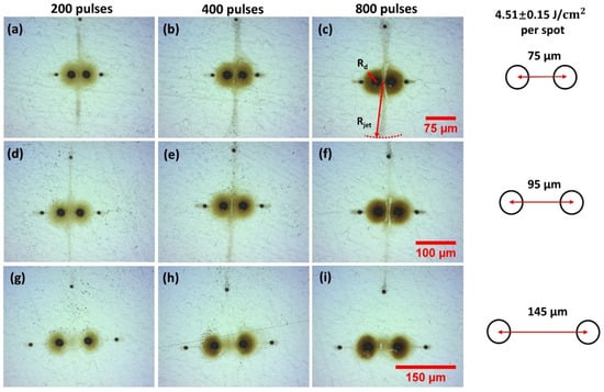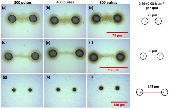 The effect on debris re-deposition of increasing fluence to F = 4.51 J cm−2 on stainless steel is shown in the optical images of Figure 4a–i. At this higher fluence in Figure 4a–c, we observe diverging debris jets ejected normal to the spot axis. This extends to a radial distance of Rjet ~200 µm, well beyond that around each spot Rd ~ 30 µm, inferring that an energetic process may be involved. In Figure 4b,c, with increased exposure, removal of debris from the surface between the spots (in the form of two slightly curved lines) supports the view that strong shock wave interactions between the colliding plumes during ablation may be responsible, clear in Figure 4c,f. These effects essentially disappear at the highest, 145 µm separation with a return to the concentration of material between the spots Figure 4g–i, similar to the patterns at low fluence (Figure 3). The tiny ablation spots along the axis are due to low energy ghost beams appearing during multi-pulse exposure, while the top spot is the remaining zero order. Their presence here helps detect local physical effects of shock wave and air movements affecting the debris motion.
