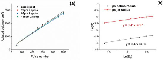The measured ablation volume/pulse of single and two spot geometries with pulse number N is shown in Figure 5a for a fluence F = 2.9 J cm−2 (Ep = 6 µJ/pulse). These results confirm that ablation rates are essentially independent of spot geometry and spot separation when N ≥ 200, whether single or double spot, within experimental error. Hence, the proximity of the spots does not affect ablation rates significantly. The ablation volume/pulse V ~ 5.7 µm3/pulse corresponding to a mass ablation M ~ 0.05 ng/pulse. Crater volumes and geometries were measured with a white light interferometer, Wyko NT3300. The single spot debris radius and jet radius with pulse energy and exposure are shown in Figure 5b on an Ln-Ln plot. This confirms that the debris radii follow a power-law R ∝ E0.47 for a single spot while the much higher Jet debris radii, Rjet ∝ E0.41. This relationship approximates that predicted by blast wave theory [59], however, higher than the expected R ∝ E1/3 which has also been observed by other authors [60].
