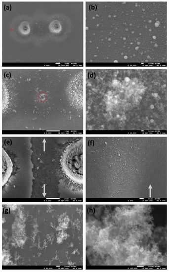 Figure 6a–d shows a series of SEM images of ablation debris from two spot ablation of stainless steel in the air with 10 ps pulses at low fluence F = 0.9 J cm−2, N = 800 pulses and spot separation d = 75 µm. The concentration of debris between spots is clear in Figure 6a, with evidence of some material ejected normal to the spot axis in the centre. At low fluence, there are two main components to the debris—particle agglomerates appear on the collision plane (and around the spots), while solid spherical nanoparticles with diameters 50–150 nm appear at the spot edge, Figure 6b. These are likely formed during collisions of the expanding plumes and condensed from the stagnation region at the midplane. Figure 6c (2000×) shows the particle agglomerates near the centre at higher magnification while Figure 6d (35,000×) confirms that the particle agglomerate consists of both solid np’s and agglomerated chains of fine np’s. There is a significant change in the nature of the debris generated at higher fluence, F = 4.8 J cm−2, as shown in the SEM images of Figure 6e–h. Deposition now produces a thick deposit near the ablation spots while the shock waves lift material from the surface between the spots Figure 6e and deposit well away from the spots, Figure 6f. Figure 6g,h, with increasing magnification show that this jet debris consists of np chain agglomerates and is almost devoid of solid nanoparticles. This is consistent with higher surface temperature achieved during ablation, well above the evaporation temperature, Tev = 2861 K. The high concentration of the np chain agglomerate debris supports the assertion that this material is formed during strong stagnation of the plume collisions in the midplane.