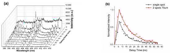Figure 7b shows the time-integrated plasma emission (Δλ = 395–415 nm) for single and double spot (d = 75 µm) confirming that the plasma lifetimes τ1/e ~ 9.2 ± 1.0 ns and 13.9 ± 0.7 ns, respectively, hence double spot plasma lifetime increasing over the single spot. These lifetimes are similar to those observed with 20 µJ, 150 fs laser ablation of Al in the air [21]. The short plasma lifetimes are a consequence of both the low pulse energies and rapid collisional cooling of the dense ambient air.
