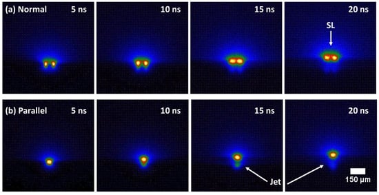 By removing the ICCD from the spectrometer and placing this at the image plane of the focus lens, (f = 75 mm, M ~ 4), the time-resolved plasma plumes were observed, Figure 8. Gate width here is 5 ns, energy/spot = 20 µJ and spot separation d = 75 µm. With spots normal to the optic axis, we can observe plasma expansion, collision and stagnation after 15 ns. When the plumes are imaged parallel to the optic axis and 10–15 ns delay, we see some interesting structure at right angles to the spot axis which may be connected to the jets. The lateral plume expansion velocity can be estimated to be v⊥ ~3.5 × 103 ms−1, decelerating after 15 ns, while the elliptical plume shape which develops supports lateral plasma expansion [35,63].