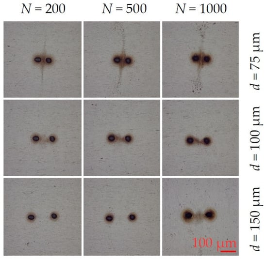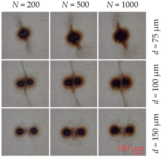 Resulting debris re-deposition and jet formation after 600 fs laser double pulse ablation with fluence F0 = 1.41 J cm−2 (EP = 5 µJ/pulse). Optical images of stainless steel surfaces after applying for various pulse numbers (200, 500, 1000) at different spot separations (50 µm, 100 µm and 150 µm). Debris jets are visible at 75 µm at the investigated N. At larger separations, the debris is concentrated in a filament between the spots (d = 100 µm) and becomes apparent at d = 150 µm separation, N = 1000. Fluence here is 1.5 times higher than with 10 ps pulses (Figure 3).
