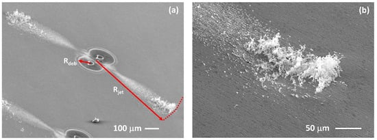 Tilted SEM images of the jets after double spot femtosecond ablation of s. steel in the air (EP = 20 µJ/pulse, N = 1000, d = 100 µm). (a) shows the symmetric diverging debris jets (np chain agglomerates) with an accretion of material at the jet ends, almost 400 µm from the double spot centre. (b) higher magnification of concentrated jet debris near the jet end. The debris radii near the spots and jet radii are indicated (Rdeb and Rjet respectively).