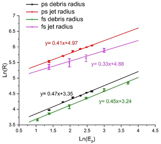 Ln-Ln plots of the two spots debris and jet radii ([R] = µm) measured for 600 fs and 10 ps ablation. The logarithmic fits ([EP] = µJ) are shown to be reasonably close in exponent except for femtosecond ablation which is lower. The spot separations were 100 µm (600 fs) and 75 µm (10 ps), respectively. Error bars represent 1 σ.