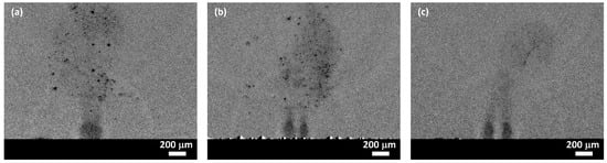 Ablation plumes and their development after ablation were imaged with the pump-probe experimental set-up shown in Figure 2. The probe beam (λ = 688 nm, τH = 13 ns) was electronically synchronised to the pump beam (λ = 1030 nm). Time-resolved measurements are often carried out with a single pulse exposure–but here, after simultaneous multi-pulse, multi-spot exposure, we can see the developing plumes and their interactions. The connection axis of two spots is aligned perpendicular to the imaging plane. The total delay time regarding the arrival of the first pulse pair with 5 kHz repetition rate is τ = 1002 µs, hence a delay time of 2 µs after the last, N = 6th pulse, Figure 13. There is a strong plasma plume overlap confined to the surface at d = 100 µm separation with diverging plume above the spots containing solid (dark) micron size particles, strongly absorbing/scattering. The previous pulses have formed these. These also appear at 150 µm spot separation but disappear entirely at d = 200 µm, where the plasma plumes near the surface are distinct and plume absorption much more uniform. This particle is likely the np chain agglomerate observed on the surface, shown in the SEM images of Figure 11. which appear in the jets due to the strong plume interactions. Note in the shadowgraphs a visible expanding spherical shock wave from the last pulse pair overlaps the material previously ejected. The shock wave speed, from the time delay, vs ~375 m/s just above the speed of sound while the lateral plasma expansion has slowed significantly to around v ≤ 50 m/s after 2 µs delay.