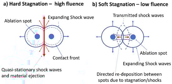 At low fluence and larger separations, shock wave pressures are much reduced, plasma density decreases, reducing stagnation to “soft”, hence allowing plasma interpenetration between the spots. Weak shock waves pass through each other and likely reflect back along the axis from the plasmas. Multiple collisions can decelerate ions and a degree of ion reflection may occur [64] so that particles acquire momentum directed along the spot axis then arrive at the surface through backward flux, Figure 14b.