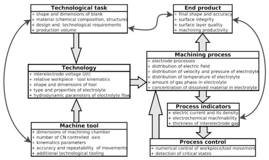 Figure 1 are essential. The goal of the machining (or technological task) is to produce a series of parts made of specified material which meet requirements of the design. The production should be cost-effective; therefore, it should be executed with desired productivity and energy consumption. Depending on these requirements, the choice of appropriate ECM technology means choosing optimal type of the interelectrode voltage (direct or pulse), relative workpiece-tool movement, selection of electrolyte (type and concentration), and electrode-tool shape, and dimensions. One can state that such decisions strictly depend on the specification of a machine-tool. This is because dimensions of a machining chamber (or table) and possibilities of additional technological tooling installation limit possibilities of technological task implementation.