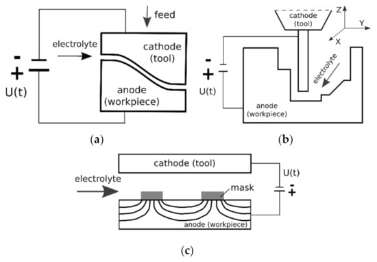 22]. Due to development and improvements of machine-tools, power suppliers, electrolyte stations, and control systems, the technological borders of PECM were shifted toward more accurate and precise machining. The decrease of gap thickness significantly below 100 μm allows for shaping of more accurate 3D structures with relatively high efficiency (i.e., sinking process takes place with feed rate 0.1–3 mm/min). Therefore, in recent years the application of ECM has been extended to new areas of precise machining: precise mechanics, jewellery, optical instruments, chemical devices, and the medical and pharmaceutical industry. Everywhere the method of machining of small, sculptured, precise and made of difficult-to-cut materials parts is needed. Above mentioned advantages and developments of ECM technology made application of ECM profitable also for mid-series or even in some cases for small-series production.