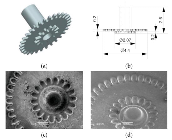 Another essential aspect of the manufacturing process is its repeatability. The results of the research using rotary PECMM example showed that despite the problems with effective electrolyte supply and gap flushing, the satisfactory results can be obtained. Preliminary research made it possible to determine the optimal process parameters to be used in further machining. Dimensions of the machined cavities differed from those assumed by less than 1%, which can be considered a good level of repeatability of the process. Presented procedures can be effectively used in the production of microforming tools, prototypes, and short series of microparts.