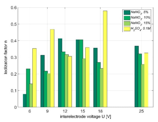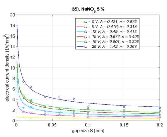 It has to be emphasized that, defined by the Equation (3), localization coefficient n cannot be used as a measure to compare machining cases with different ranges of gap size. Such a comparison is possible based on localization coefficient defined by the Equation (4). The type of approximation function q(S), proposed in such a way, allows to introduce dimensionless coefficient as exponent n and to qualitatively compare dissolution conditions in aspects of precision and accuracy. However, it should be stressed that obtained functions differ in dimension of value A; therefore, physical interpretation is challenging.