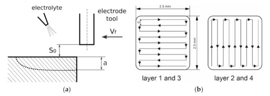 Finally, the case studies covered application of pulse electrochemical micromachining (PECMM) in electrochemical contour milling (shaping shallow cavity) and shaping conducted with sidewall surface of rotating tool (rotary PECMM). In the first case, the primary test with machining of simple shapes (grooves) allowed to select the most effective process parameters for further process development. These enabled to determine the efficiency, surface roughness of the obtained parts, and the localization of the process. Shape and size accuracy depend also on the appropriate machining strategy related to the choice of the tool trajectory and the method of electrolyte feeding to the machining area. This was presented on the example of roughness the value of which depends not only on the set of machining parameters, but also on the selection of the distance between passes. This value is resultant of the process parameters and the method of its implementation. As a conclusion, the obtained results show that microelectrochemical machining with its precision and accuracy is suitable for industrial application.