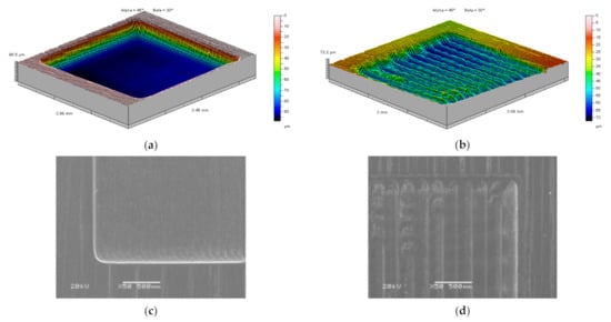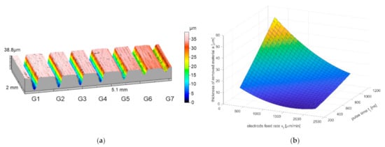 Figure 12a). It allowed to determine the depth, volume, and roughness of the obtained structures. Relations of the machining efficiency, roughness, thickness of the removed material and the volume of the removed material were investigated as a function of the pulse duration, feed rate, voltage, and thickness of the interelectrode gap. For the regression model, a second-degree polynomial was assumed as a function approximating the research object (also including the analysis of regression coefficient significance and adequacy of the polynomial). The final goal was to shape a cavity with dimensions of 2.5 mm × 2.5 mm. During the machining, the initial interelectrode gap