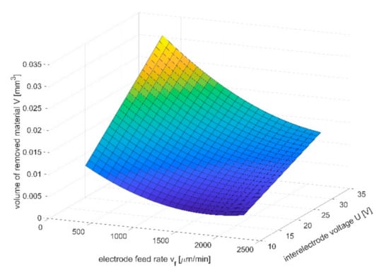 Figure 13. The volume of the removed material increases with the increase of voltage and decreases with the increase of the electrode-tool feed speed. Minima for the chosen feeds, which can be observed in the
