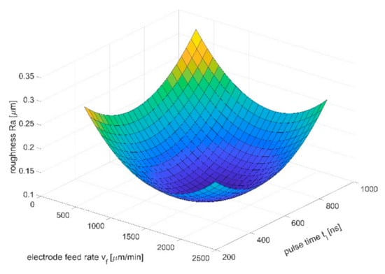 Figure 14 shows Ra as a function of the feed rate and the pulse time. The Ra value is in range from 0.1 to 0.35 μm and its lowest value is in the center of the research plan. This is due to the fact that at low feed rates and short pulse times, dissolution lasts long enough for the roughness to increasing, as described previously. For high speeds of the electrode tool, uneven dissolution occurs, which also can lead to increased roughness. With an appropriately selected input parameters, the lowest roughness value can be obtained.