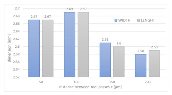 Figure 17, the average length and width of obtained cavities were presented. As one can see, width and length differ slightly (less than 10%) from the nominal value (2.5 mm). This indicates the need for electrode-tool trajectory correction. The obtained cavity depth varies from 60 to 130 μm (