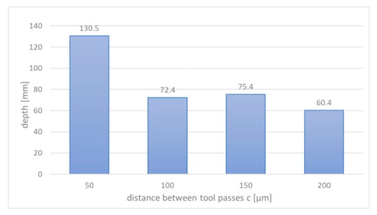 Figure 18). The process parameters (voltage level, voltage pulse time) have impact on the obtained results. However, it is worth to note that during the machining of the cavity, the electrode-tool was moved on the same level, so the differences in depth are mainly related to distances between tool passes. A consequence of using cylindrical electrode tool is an uneven dissolution in cross section perpendicular to the feed direction (the thickness of the removed material decreases with the distance from the tool axis). Increasing the distance between passes of the electrodes causes the areas of the unremoved material to appear, which is due to the reduction of dissolution area to the area of the forehead of the electrode only.