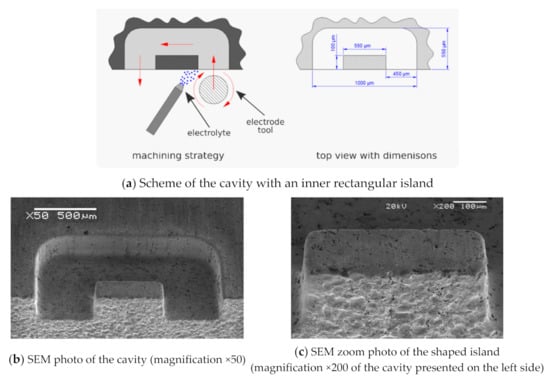 Figure 21) in rotary ECMM kinematics. The following dimensions were assumed for the island: length—550 μm and width—100 μm. However, the final obtained shape was different from the assumed one. The length of the machined island was 547 μm and was different from the assumed one by less than 1%, but the width was 167.8 μm which was 50% greater than the assumed one. This difference can be explained by the difficulty of supplying the electrolyte to the interelectrode gap and the problem of the evacuation of electrochemical dissolution products from the interelectrode gap and the cavity. It should be noted that the position of electrolyte nozzle was fixed, so the change of the feed direction changed the electrolyte flow conditions in the gap.