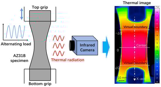 Infrared cameras collect thermal radiation emitted by the object to measure temperature in a non-contact way. In this study, the temperature change of the specimen during the fatigue test was monitored by using an infrared camera (InfraTec VarioCAM hr, InfraTec, Dresden, SN, Germany). A layer of black matt paint was sprayed evenly on the surface of the specimen in order to increase the emissivity and reduce the reflection. Prior to this, the surface of the specimen was smoothed with metallographic sandpaper. The collected temperature data were stored in the form of thermal image at a rate of 50 frames per second. Each pixel in the thermal image represents the temperature value of the corresponding position of the specimen. A large number of thermal images will be generated during the entire fatigue test process. For more experimental details, see reference [].