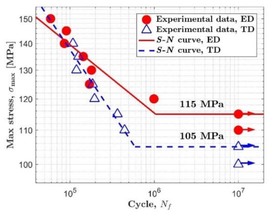 As can be seen in Figure 2, the knee point can be confirmed in each orientation. S-N curves of AZ31B magnesium alloy in both orientations show obvious bilinearity, which is similar to the situation with most steels. The AZ31B magnesium alloy used in this study seems to possess a definite fatigue limit regardless of material orientation. Similar S-N curves were also reported in References [,]. So, the fatigue strength under 107 cycles can be defined as the fatigue limit. The fatigue limit of AZ31B magnesium alloy is 115 MPa in the extrusion direction and 105 MPa in the transverse direction.