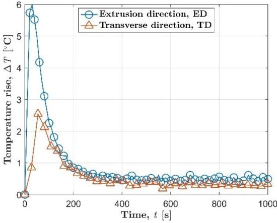 The relationship between self-heating and load was discussed by summarizing the experimental results under different loads in this section. As illustrated in Figure 4, three commonly used thermal indicators [,] are selected to represent the self-heating data under different loads in this study, which are the initial temperature rise slope, ΔTslope, the maximum temperature increase, ΔTmax, and the temperature increase in the stable stage, ΔTstable. A dedicated Matlab program was used to automatically calculate these three thermal indicators according to the temperature evolution curve. In particular, the initial temperature rise slope is calculated based on the temperature data of the first 10 s by using a linear fit. The maximum temperature increase takes the maximum value of the entire temperature evolution curve. The stable temperature rise is calculated by averaging the temperature data over a time interval of approximately 100 s during the stable phase. Figure 5 summarizes the self-heating data under different loads, which are respectively represented by the three thermal indicators mentioned above. For the extrusion direction, all three thermal indicators are symbolized by blue circles. For the transverse direction, yellow squares are used to represent the thermal indicators. In addition, all data points above the fatigue limit (determined according to the S-N diagram in Section 3.1) are marked with black dots for both orientations.