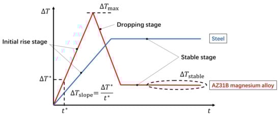 Either in the extrusion direction or in the transverse direction, an obvious hump and the subsequent approximate horizontal line can be observed on the temperature change curve in Figure 3. This is a typical trend shared by AZ31B magnesium alloys under different stress levels. The characteristics of the temperature evolution curve of AZ31B magnesium alloy during fatigue are quite different from those of steel. For engineering steels, the temperature evolution on the specimen surface is characterized by two stages when the applied cyclic load is higher than the fatigue limit: an initial rapid increment, then a plateau region, as shown in Figure 4 [,]. However, it is more appropriate to divide the temperature evolution curve of AZ31B magnesium alloy into three stages: the initial temperature rise stage, the temperature drop stage, and the temperature stable stage. Following the work of Doudard et al. [], the trend of temperature evolution before the appearance of macro fatigue cracks allows one to determine the cyclic hardening type at the micro-scale. The three-stage temperature evolution shows that AZ31B magnesium alloy has undergone cyclic hardening in both orientations [], which is consistent with the conclusions of the study using mechanical methods []. Furthermore, the two-stage temperature evolution curve shows that this type of steel undergoes constant isotropic hardening under cyclic loading [].