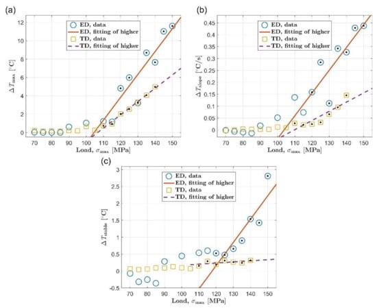 Fatigue limit evaluation using the Risitano method, transverse direction: (a) maximum temperature rise, ΔTmax; (b) initial temperature rise slope, ΔTslope; (c) mean temperature rise of stable stage, ΔTstable.