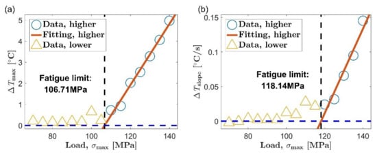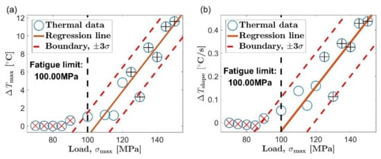 Based on the statistical law represented by the regression line and the two boundary lines, the classification process can be carried out by using a graphical approach in the new method. Check the self-heating data outside the initial set one by one according to the load level from high to low. Stop the test when a data point is found outside the boundary line for the first time. Other data points whose load is lower than the first point outside the boundary line can be considered as viscoelastic dissipation, since the heat generation usually increase monotonically with increasing load []. In this way, the self-heating data corresponding to the two self-heating mechanisms can be distinguished. Then, the fatigue limit can be determined as the lowest load level corresponding to the data points of the microplastic dissipation.